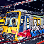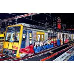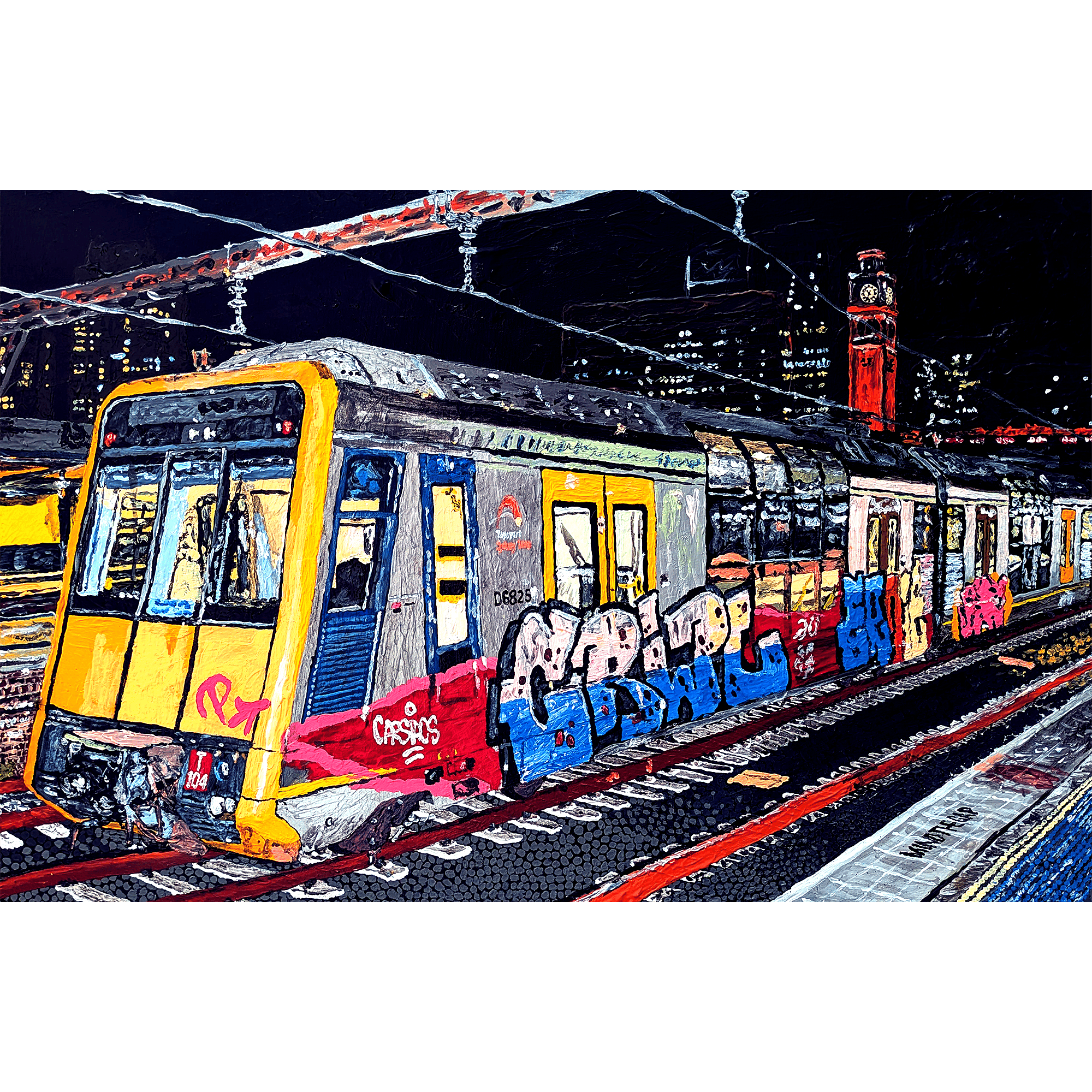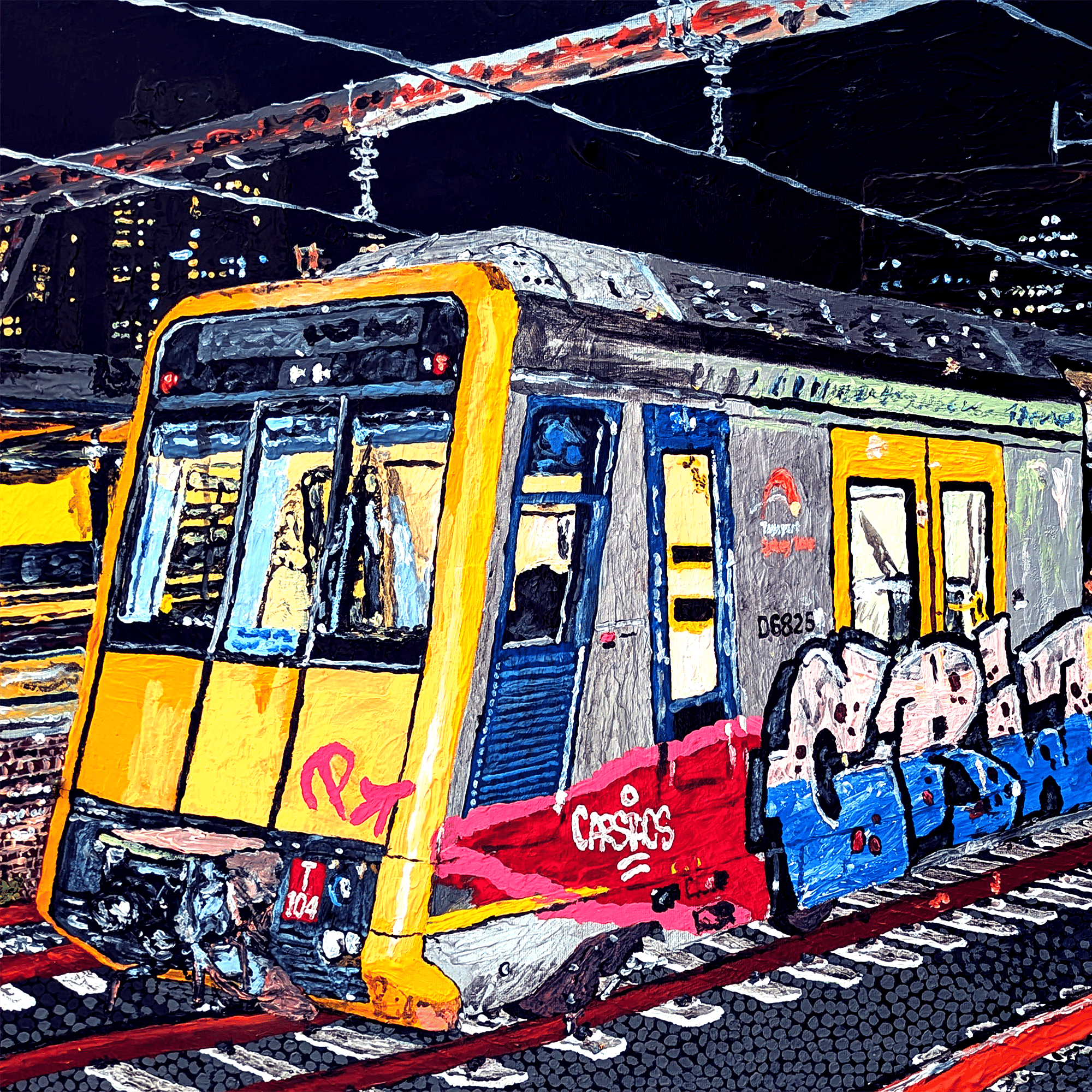 Christopher Hummel, 2025, Cityrail Tangara T set (ex-G set) at Central at Night, Acrylic on canvas, 51cm × 76cm.
