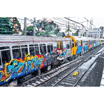 Christopher Hummel, 2025, Queensland Rail EMU and SMU 200 Series with graffiti during the 2011 floods, Acrylic on canvas, 61cm × 91cm.